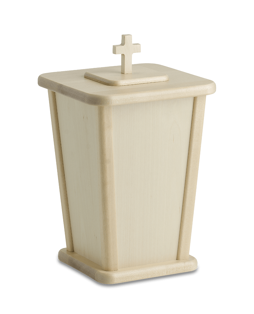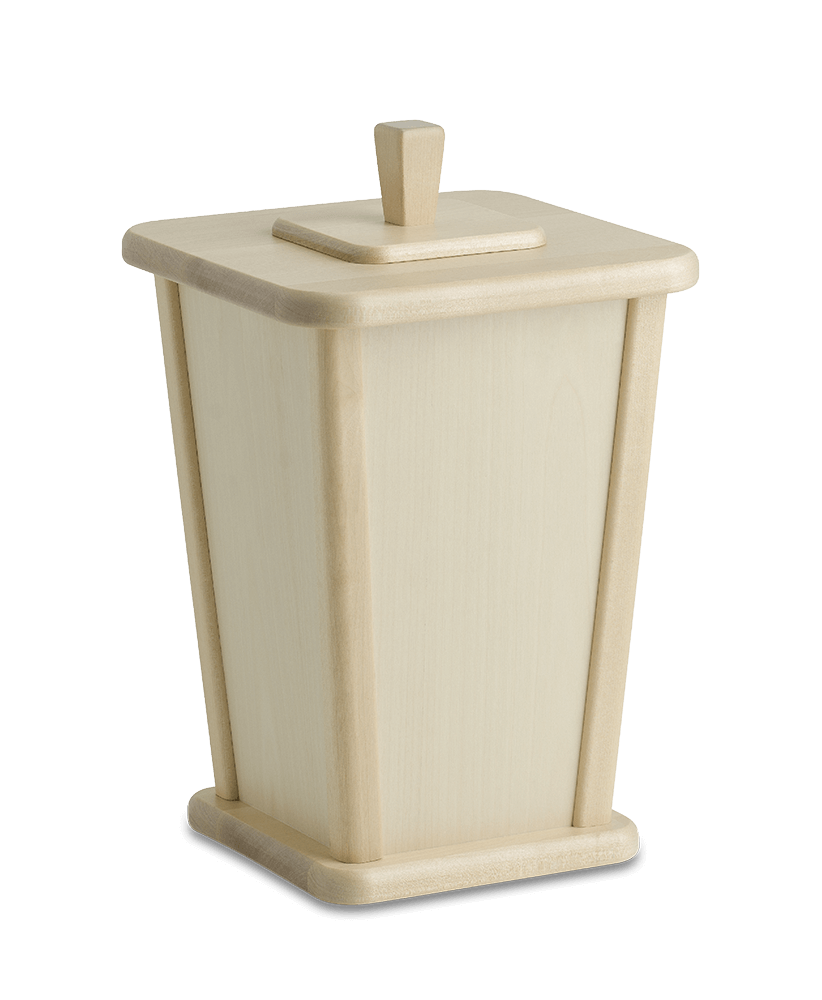 Klassisk urna av förgängligt massivt trä och fanerad träfiberskiva i björk. Finns med rak knopp eller korsknopp. Tillverkad av certifierat trä från hållbart skogsbruk i Sverige.